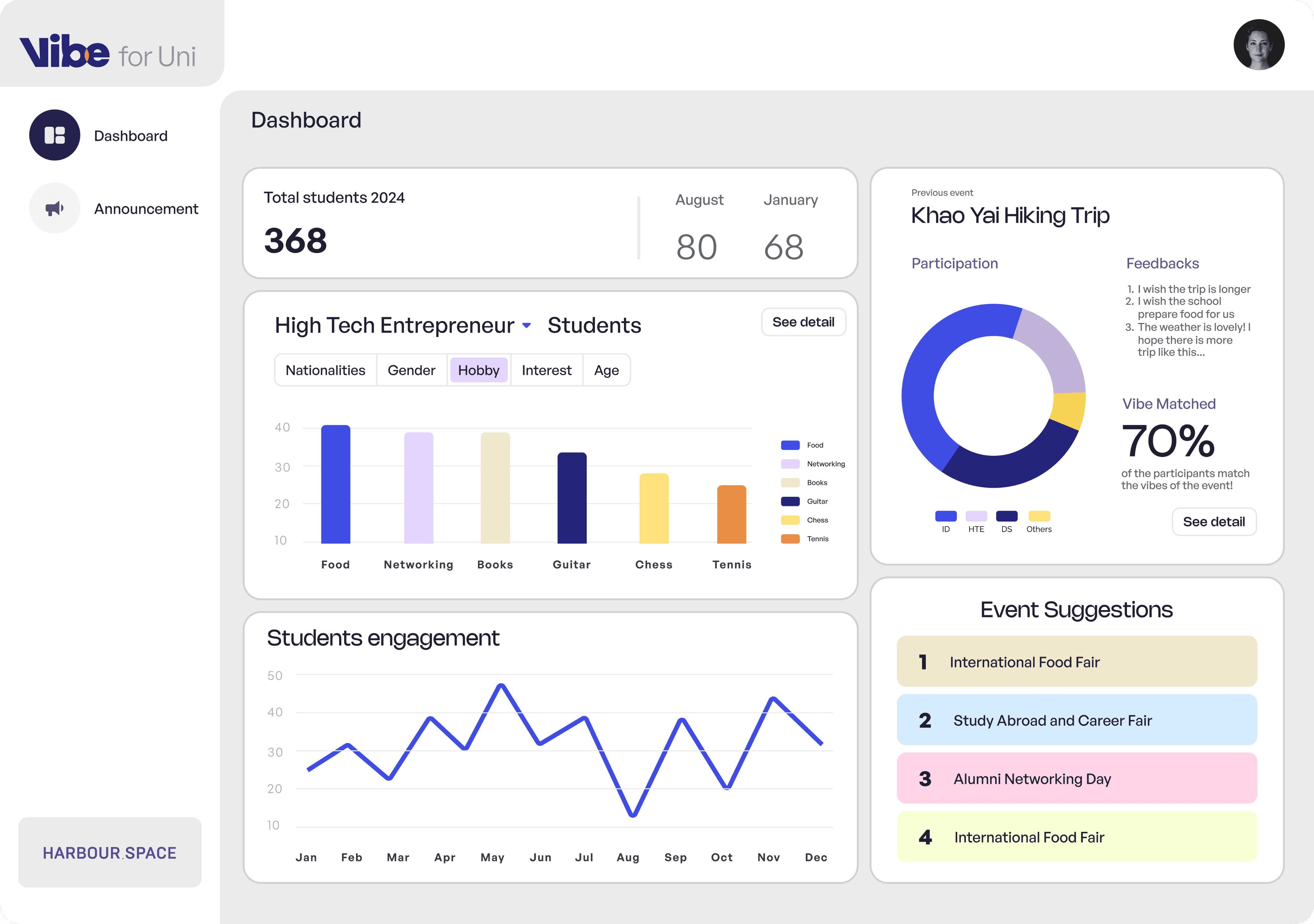 As mentioned before, we have our faculty members as out secondary persona. A way to track and manage activities for events that are hosted. This dashboard is accessible through Vibe for UNI which is for staff members to view statistics.
